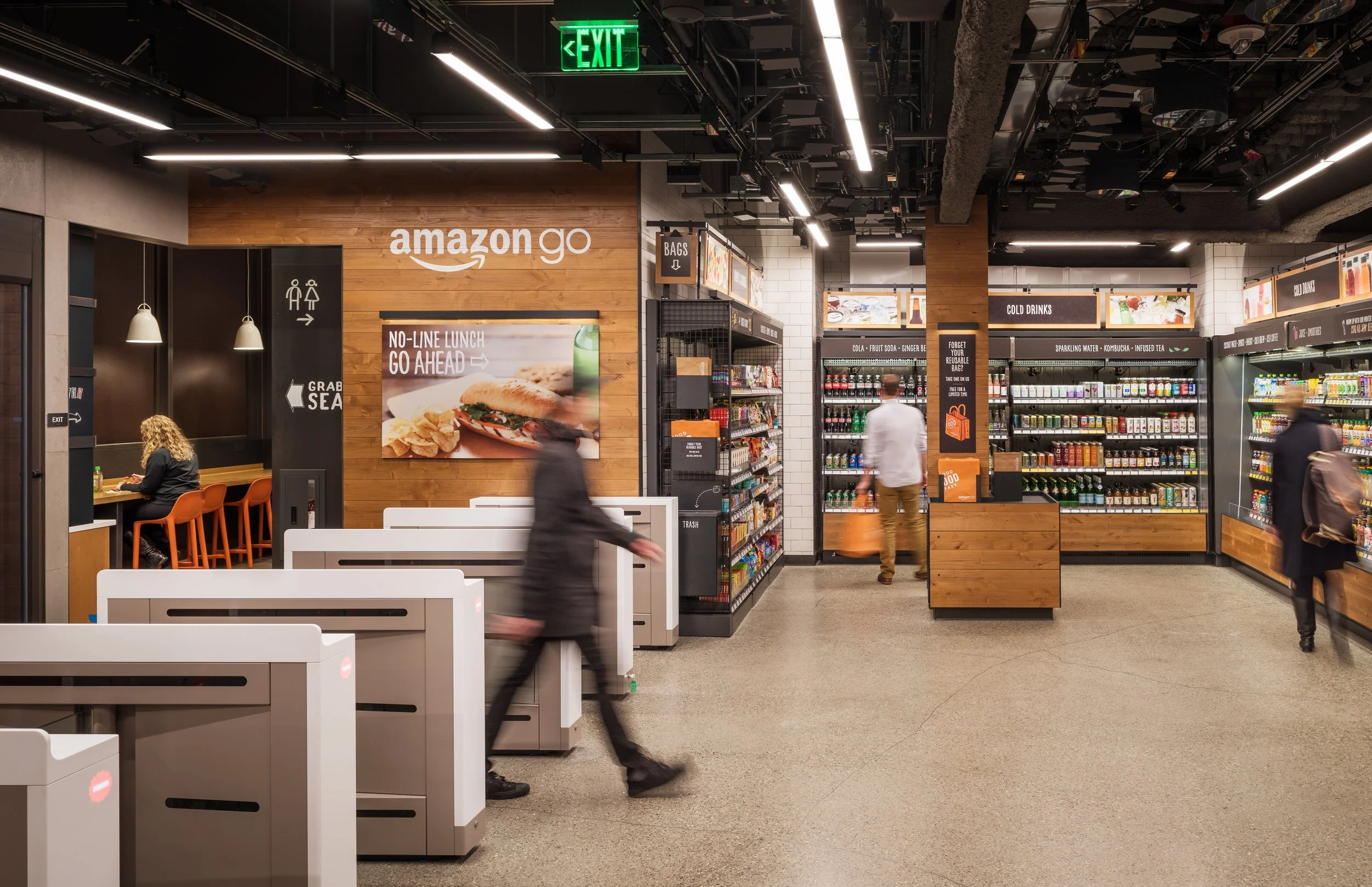 Amazon Go is a store with the world’s most advanced shopping technology so you never have to wait in line: simply use the Amazon Go app to enter the store, take the products you want, and go! No lines, no checkout. (No, seriously). Each store is locally-curated within a 3-6 block radius to give consumers the local taste, plus household brands, of their neighborhood. One way to make each store unique, other than the varied store design, was the marketing and environmental signage.